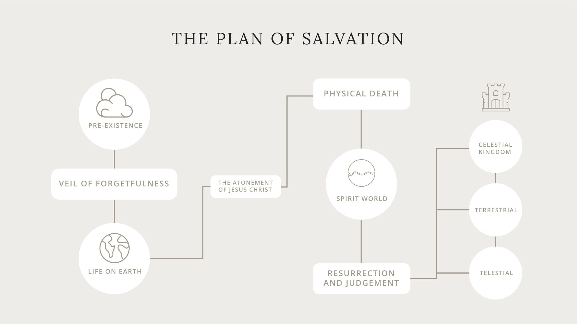Latter-day Saint theology teaches the existence of three heavens: the telestial, terrestrial, and celestial. The telestial, the lowest heaven, is reserved for those who have rejected the LDS message. The terrestrial is for Latter-day Saints who maintained connection with the Church throughout their lives but were lukewarm in their pursuit. The Celestial, which also has three layers, is for those who believed and behaved worthily. These individuals can progress to godhood, create their own spirit race, and fellowship fully with Heavenly Father. Some Plans also picture Outer Darkness, which is a place reserved for apostate Latter-day Saints who “remain filthy still.”